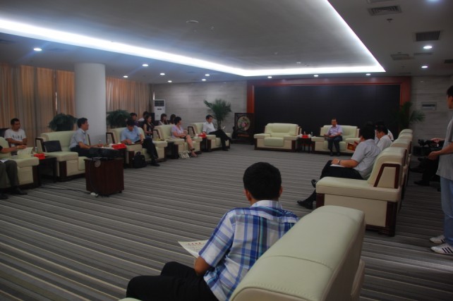 圖為:市演藝集團(tuán)總經(jīng)理曹利衛(wèi)(左一)詳細(xì)介紹鹽城市歌舞劇院演出的《鹽之城·海之歌》晚會從策劃、創(chuàng)作、排練到演出整個創(chuàng)作過程和創(chuàng)作理念。