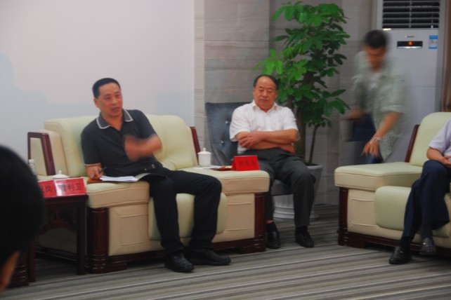 圖為:市文廣新局局長許新建(左)介紹《鹽之城·海之歌》晚會的有關(guān)情況,市委宣傳部副部長陳斌(右)參加座談會。