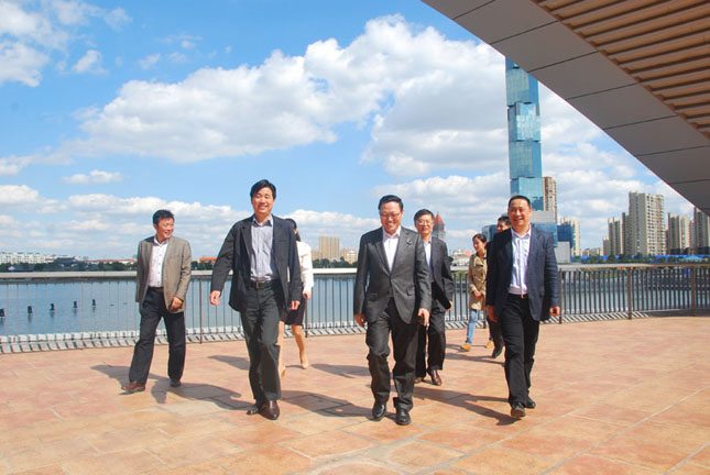考察期間,市演藝集團(tuán)黨委書記、總經(jīng)理曹利衛(wèi)(右一)向高云副廳長(zhǎng)(右二)介紹文化藝術(shù)中心各產(chǎn)業(yè)項(xiàng)目情況,市副市長(zhǎng)馬成志(二排中)、市文廣新局局長(zhǎng)許新建(左一)陪同考察。