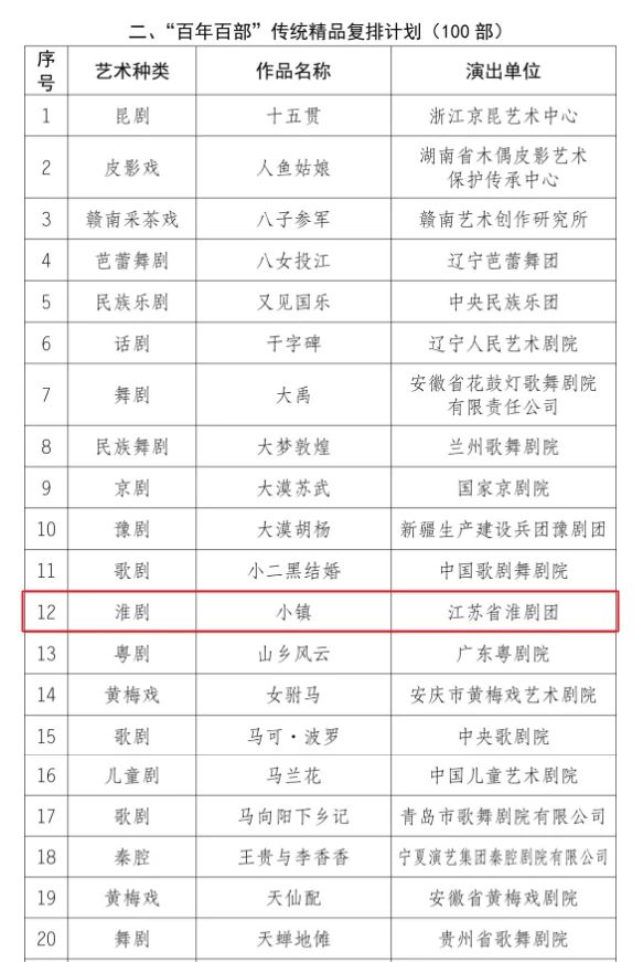 11月2日,在文化和旅游部召開的全國(guó)藝術(shù)創(chuàng)作工作會(huì)議上,公布了慶祝中國(guó)共產(chǎn)黨成立100周年舞臺(tái)藝術(shù)精品創(chuàng)作工程重點(diǎn)扶持作品名單,由鹽城市演藝集團(tuán)出品的淮劇《小鎮(zhèn)》入選“百年百部”傳統(tǒng)精品復(fù)排計(jì)劃。
